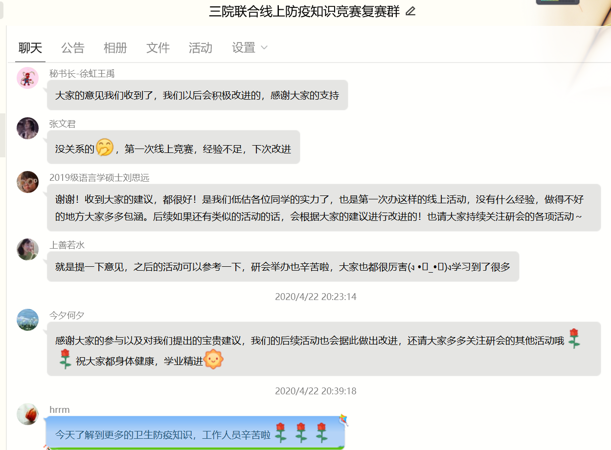 本次防疫知识比赛取得良好成效,很多同学通过本次活动学到了防疫知识、增强了预防意识。也期待今后有更多的同学参与,希望大家互相宣传防疫知识,提高防护意识。