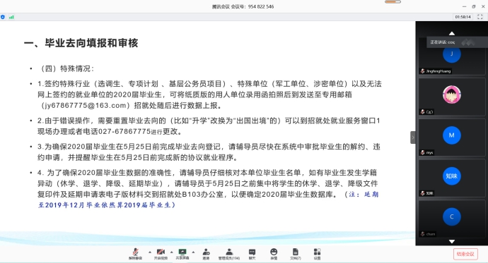华大生科讯(通讯员 王智凝)为解答公司2020届本科毕业生在毕业与就业方面的疑问,进行好2020届本科生的毕业工作,5月17日晚,2020届于腾讯会议进行了“毕业就业那些事儿”主题晚点名。本次晚点名由公司2020届本科毕业生辅导员余璇老师主持,2020届全体毕业生参与。